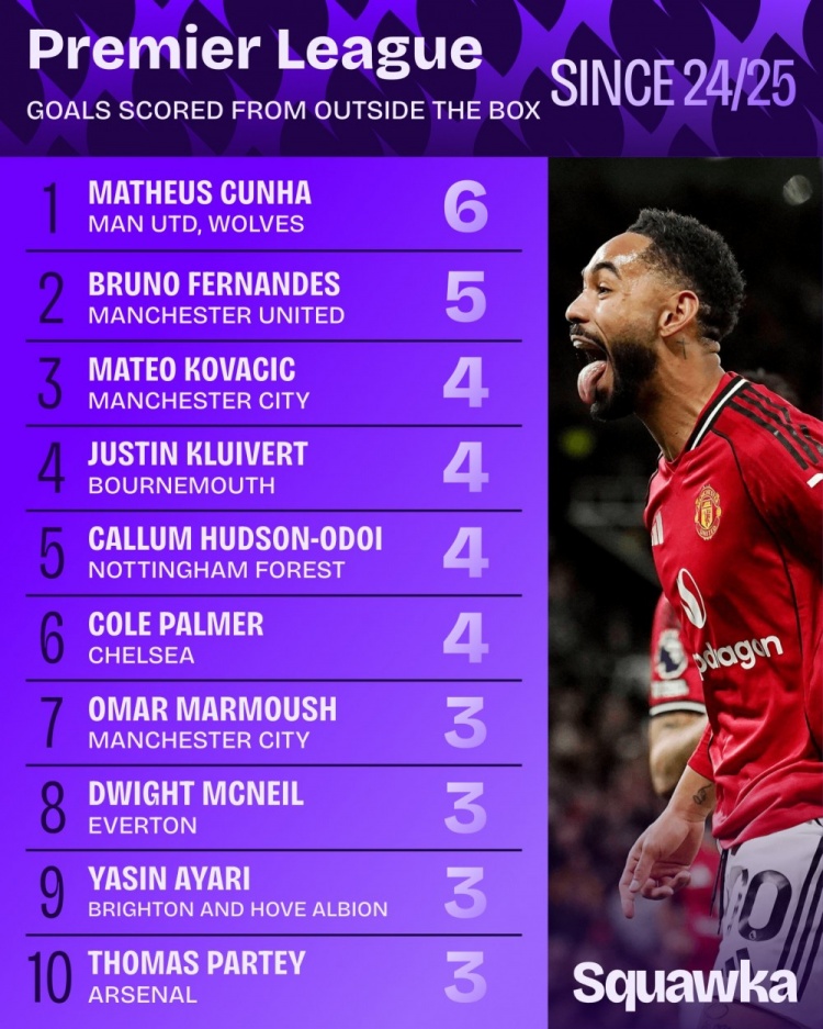 英超禁区外进球榜更新 库尼亚排名第一 B费紧随其后 帕尔默也在榜单中_英超直播