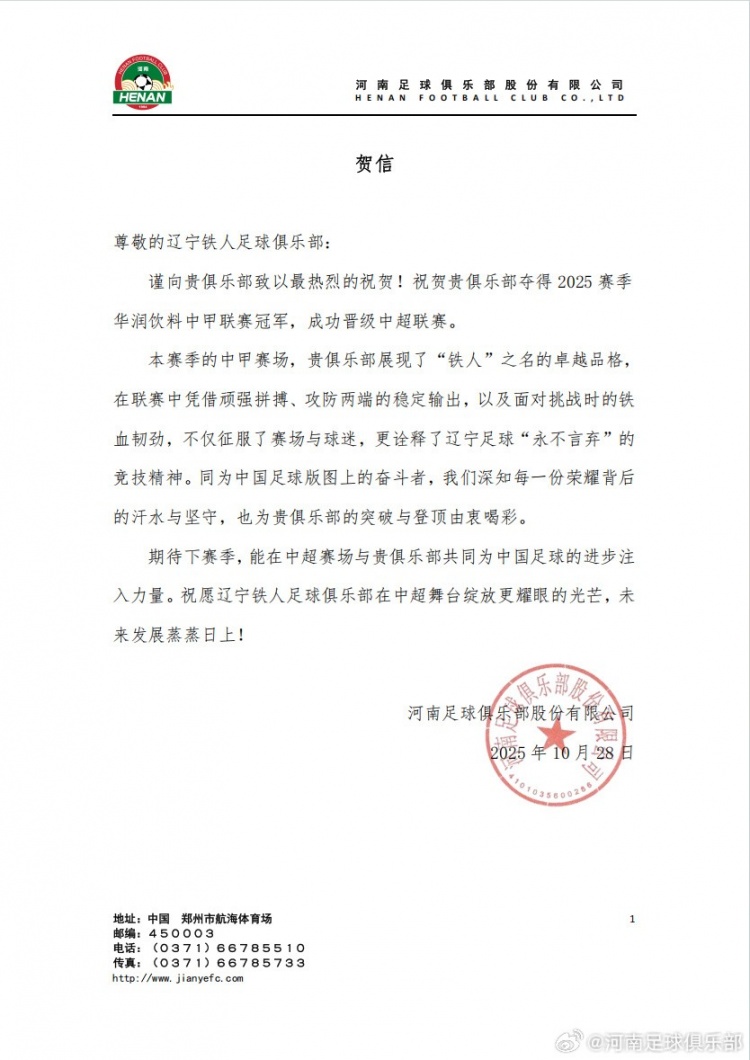 河南俱乐部庆贺辽宁铁人荣膺2025赛季中甲冠军喜提中超资格_中超直播