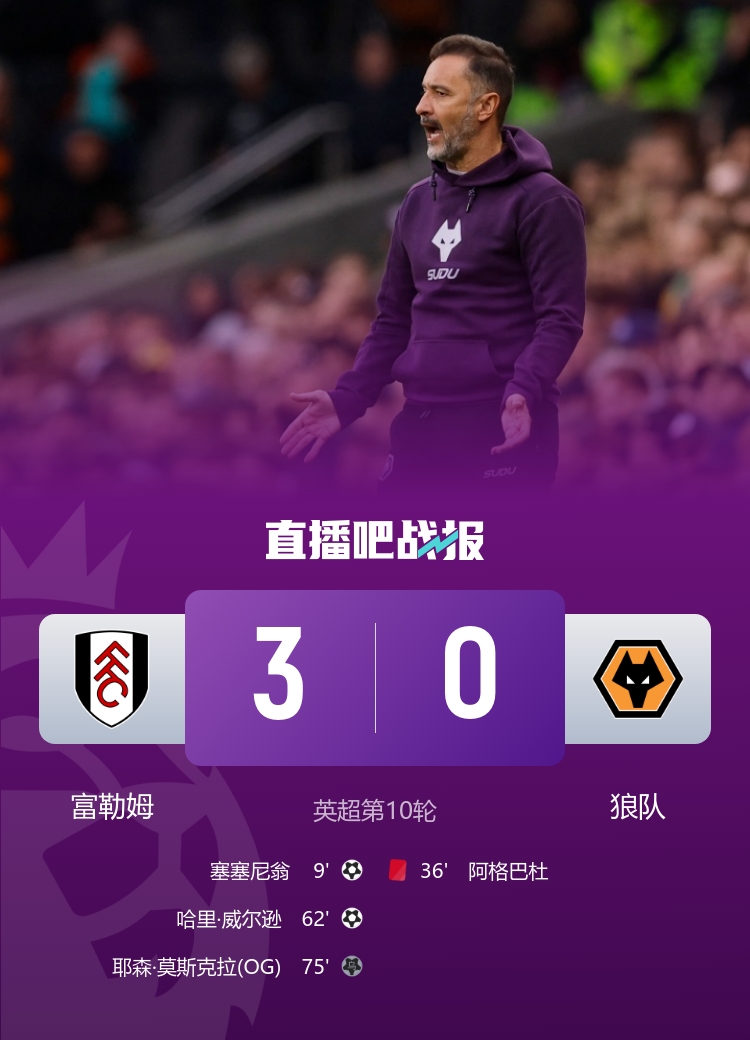 富勒姆以3-0战胜十人狼队 终结联赛四连败 狼队开局十轮不胜依然垫底_英超直播免费观看