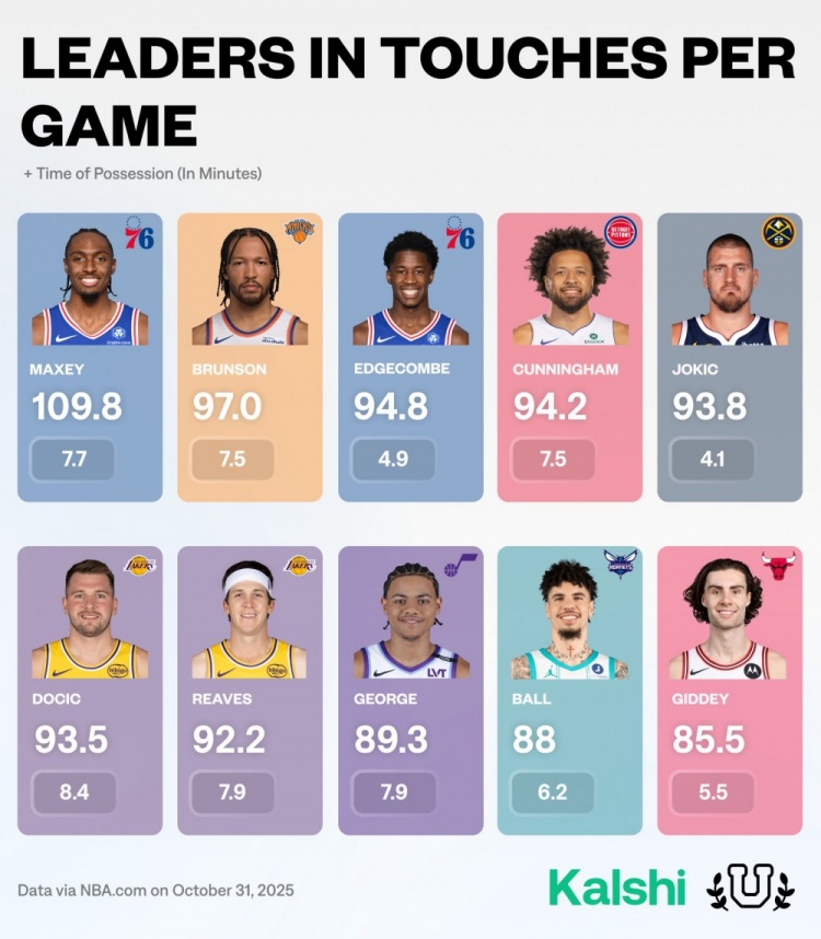 根据NBA University的最新数据统计,目前场均触球次数最多的球员中,马克西以每场109.8次的精彩表现居于榜首。他的触球频率不仅反映了他在比赛中的活动量,更突显了他的比赛影响力。在这些卓越的球员中,东契奇以场均8.4分钟的持球时间名列前茅,这显示出他作为攻防核心的不可或缺。