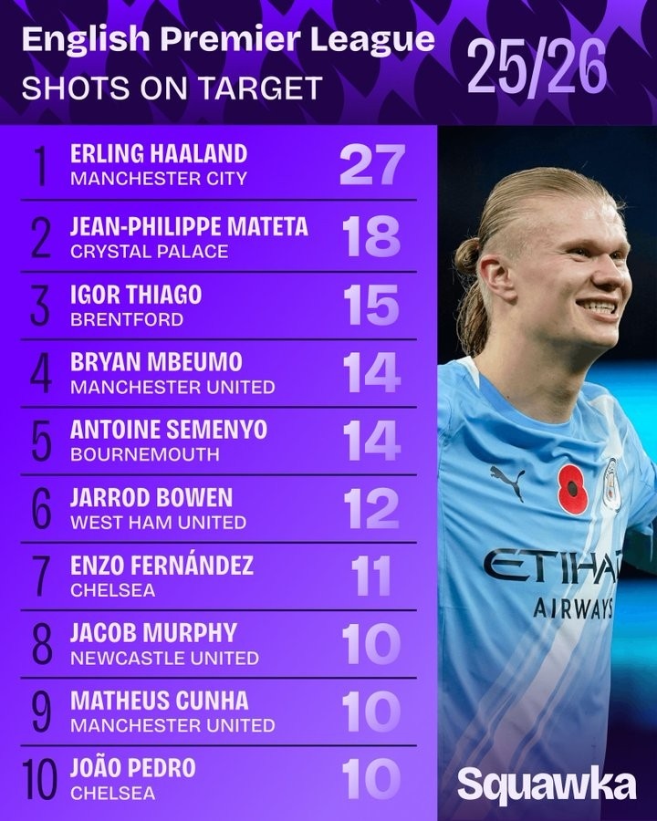 截至11月11日,英超联赛已经进行到了第11轮,相关数据统计网站squakwa发布了本赛季英超球员射正次数的排行榜,曼城的前锋哈兰德以绝对优势遥遥领先其他球员。