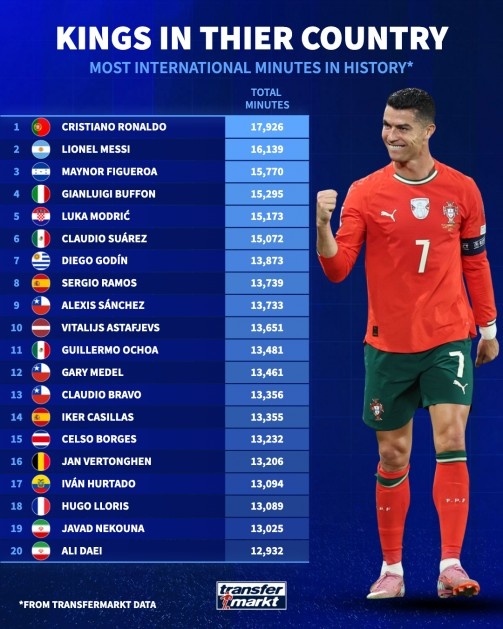 国家队出场时间排行榜揭秘 C罗梅西稳居前二 布冯紧随其后莫德里奇排行第五_足球直播在线直播观看免费