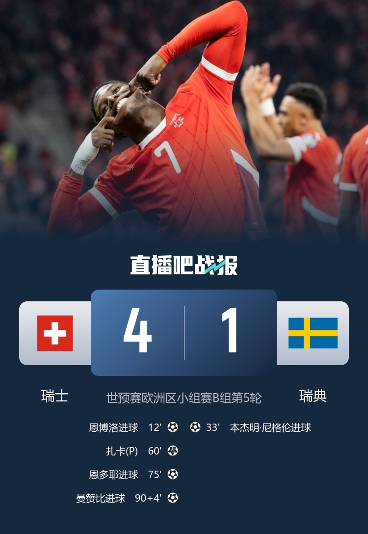 在11月16日的世预赛欧洲区小组赛中,瑞士队在主场以4-1战胜瑞典队,继续朝着美加墨世界杯进军。比赛在日内瓦球场进行,瑞士队表现出色,确保了小组第一的稳固位置。