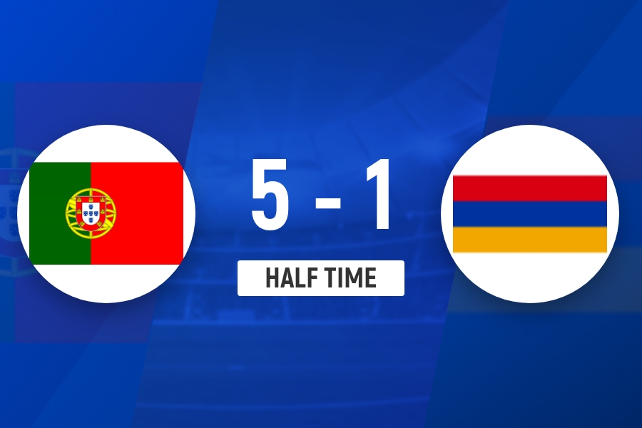 半场战报 葡萄牙以五比一领先亚美尼亚 内维斯的任意球精彩绝伦并打入两球 B费贡献三次助攻_足球直播在线直播观看免费