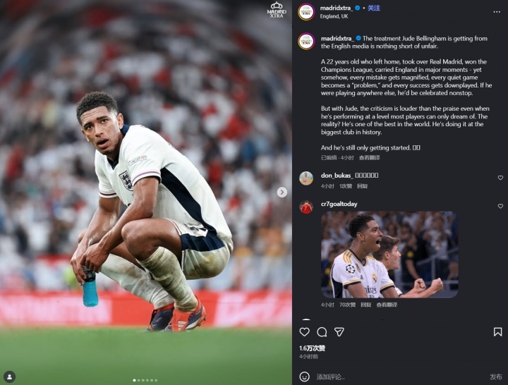 在11月18日的比赛中,英格兰以2-0战胜阿尔巴尼亚,贝林厄姆在第84分钟被替换下场。不过,赛后关于他表现的讨论引发了媒体的广泛关注,尤其是他在场上的一些不满情绪。皇马的一位博主MadridXtra对此发表了看法。