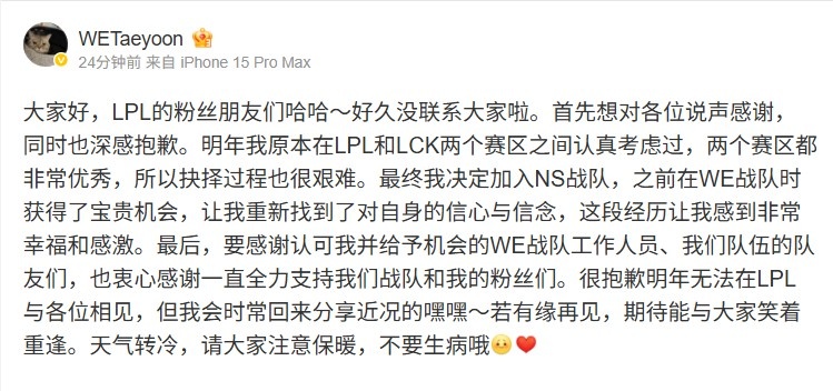 在这个充满激情与波折的电竞世界中,Taeyoon于11月19日正式宣布加入LCK赛区的NS战队。他在社交媒体上向LPL的粉丝和WE战队发出了告别信,字里行间充满了感激与不舍。