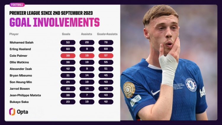 帕尔默在切尔西首秀后英超贡献57球仅次于萨拉赫和哈兰德_英超直播