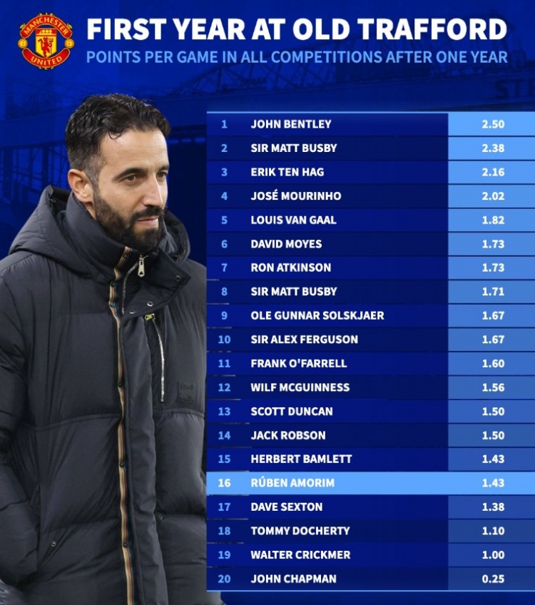 阿莫林的第一年虽充满挑战,但他并不是唯一低于预期的教练。大卫·莫耶斯与罗恩·阿特金森同样以1.73分的成绩未能取得令人满意的进展,而传奇教练亚历克斯·弗格森爵士的起步也只是1.67分。这些历史数据使人们更能理解,想要在这块神圣的土地上闯出一片天地,绝非易事。