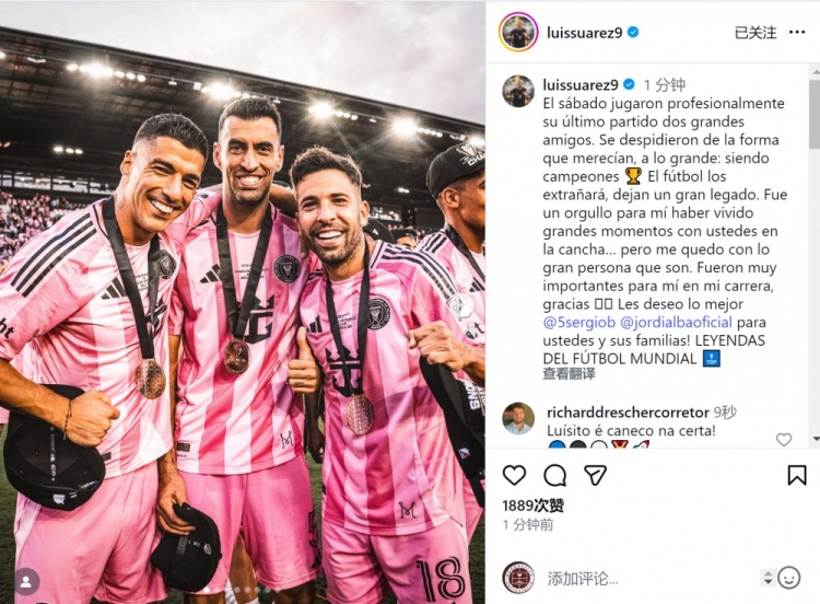 在这次动态中,苏亚雷斯分享了与两位挚友的合照,并感慨道:“上周六,我的两位好朋友完成了他们职业生涯的最后一场比赛。他们以应得的方式告别——带着冠军奖杯回家?。足球界将永远怀念他们,他们为这项运动留下了不可磨灭的‘遗产’。”