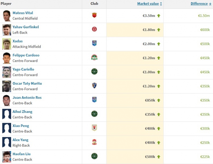 紧接着,天津津门虎的哈达斯也获得了可观的身价提升,其身价增至200万欧元,增加幅度为50万欧元,展现了球队对球队重要性的认可。而河南队的卡多索和浙江队的亚戈同样表现不俗,各自的身价上涨了45万欧元,分别达到了120万和100万欧元。