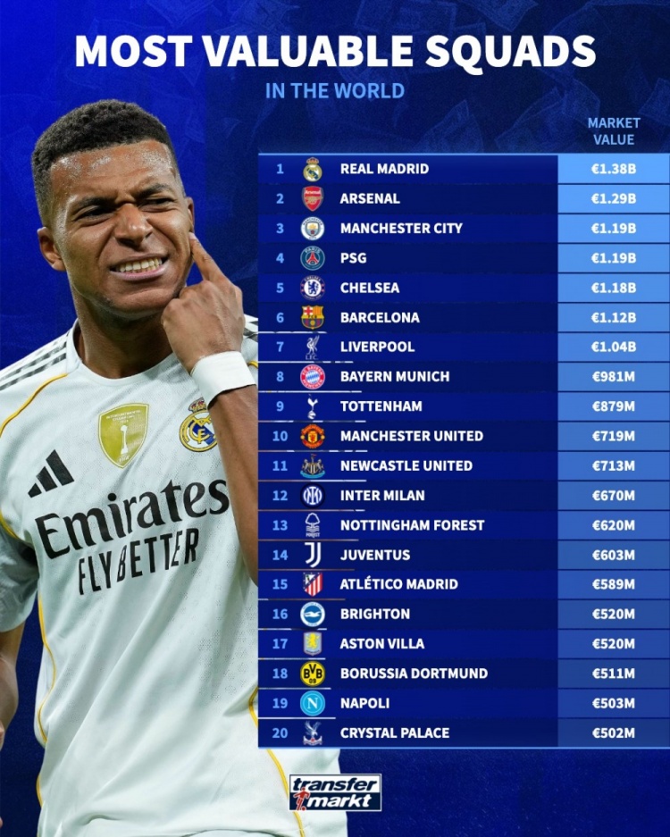 俱乐部身价德转最新排名 皇马高居首位达13.8亿欧 阿森纳曼城巴黎争相入围前四_西甲直播