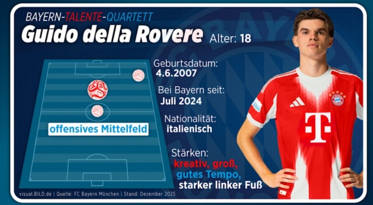 文章重点介绍了拜仁中场位置上的四位潜力新星。首先是18岁的攻击型中场圭多·德拉罗韦雷,他身材高大且技术出众,被誉为“拥有细腻的左脚技术”。作为拜仁U23队的主力,德拉罗韦雷在地区联赛中的表现相当亮眼,取得了4球9助攻的佳绩,短短一年半内其身价增长了六倍。