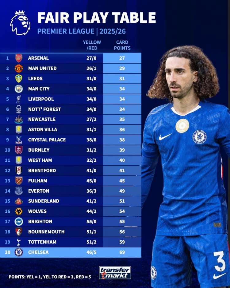 英超赛季红黄牌排行榜:阿森纳居然最少分数,切尔西却玩出了新高度_英超直播