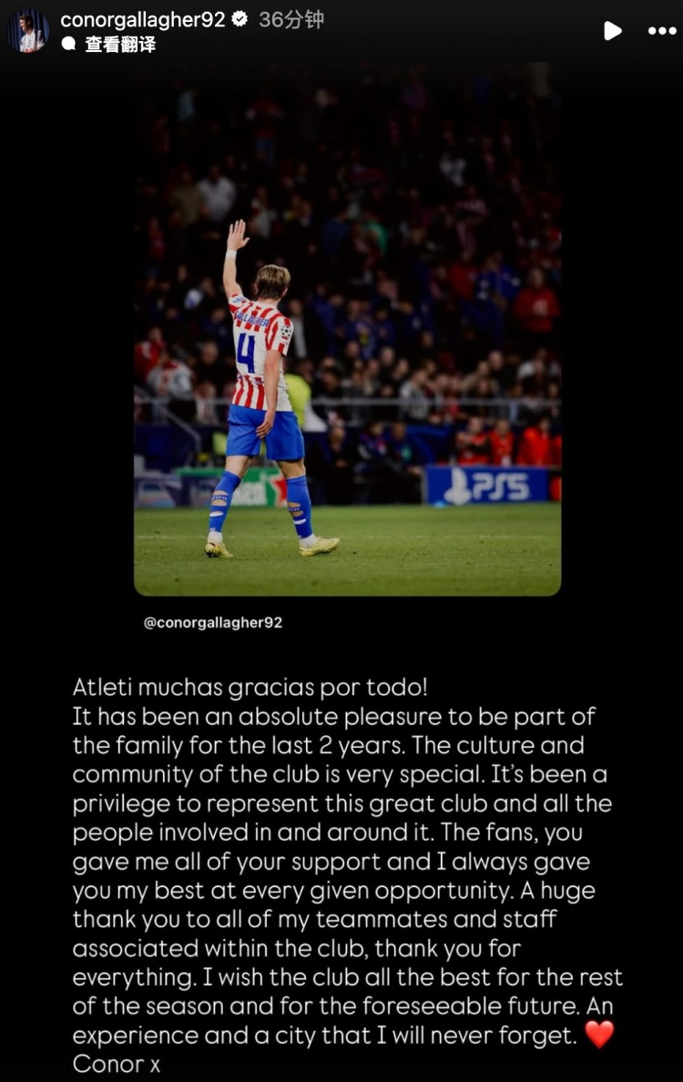 加拉格尔在社交平台发布告别信,感慨与马竞的美好回忆与感谢之情_英超直播