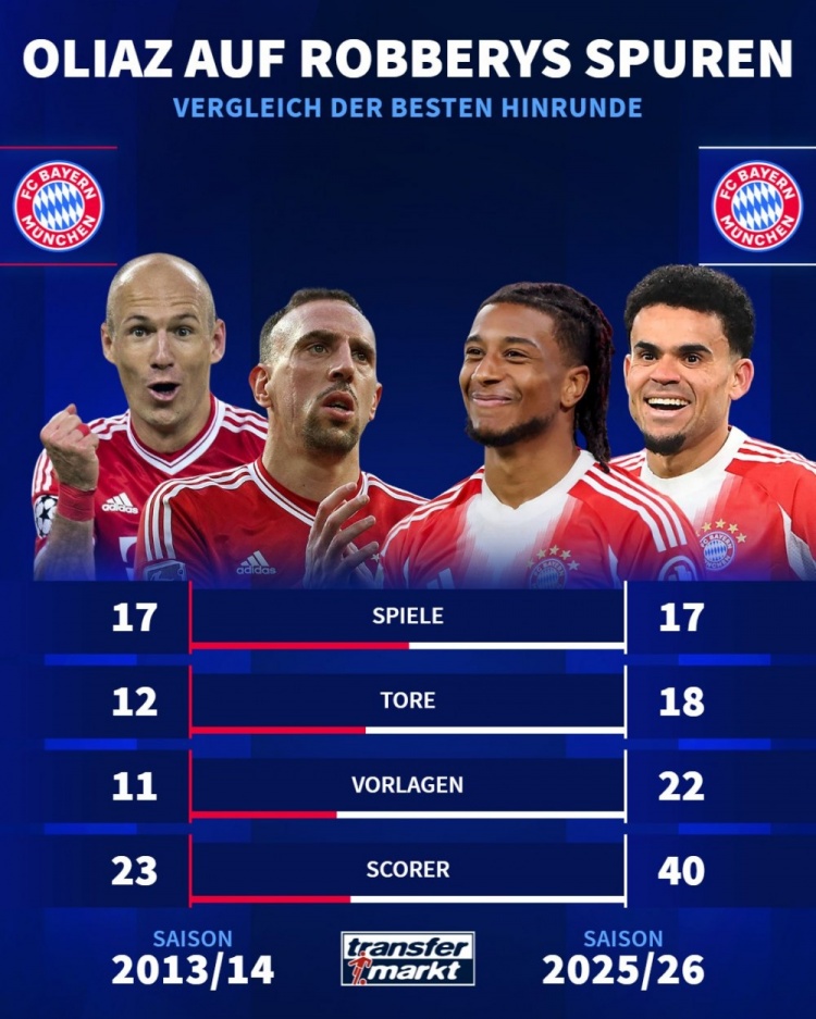 要说这事儿有多厉害,抱歉,罗本和里贝里曾经在2013-14赛季的辉煌似乎已经成了古董。当时他们只打进了12球11助攻,直接参与了23球,您没听错,23球!而如今的奥利塞和迪亚斯,甚至都没让对手喘息的机会,都快把他们的历史成就抛在了脑后。
