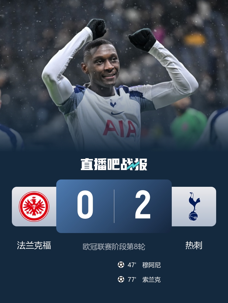 在1月29日的欧冠联赛8强战中,法兰克福主场迎战热刺。两支球队激烈交锋,最终热刺以2-0在客场奏凯,顺利晋级。同时,法兰克福以4分的积分被淘汰,遗憾止步。