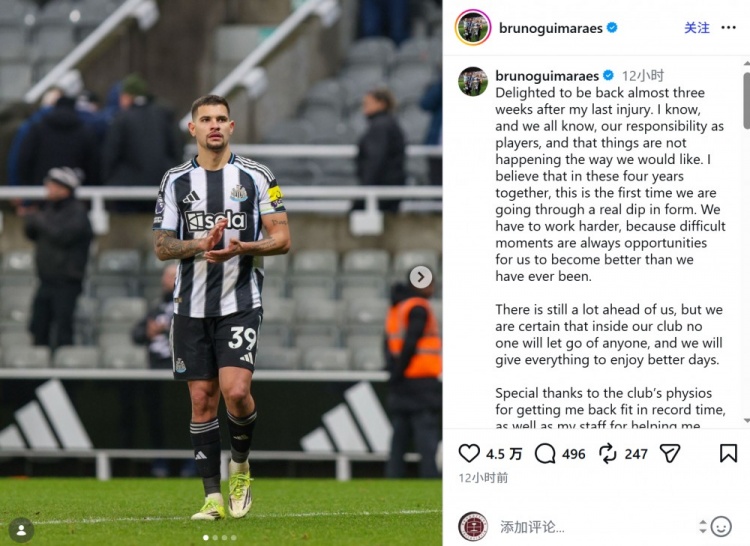 尽管前方的道路依然漫长,吉马良斯对未来依然信心满满:“我坚信,俱乐部内部没有人会放弃任何一位队友。我们将竭尽全力,迎接更加美好的明天。”他特别感谢了俱乐部的理疗团队,以创纪录的速度帮助自己恢复健康,同时也感谢自己的团队支持他尽快重返赛场,表达了对俱乐部的深厚感情和团结精神:“加油,纽卡斯尔!”