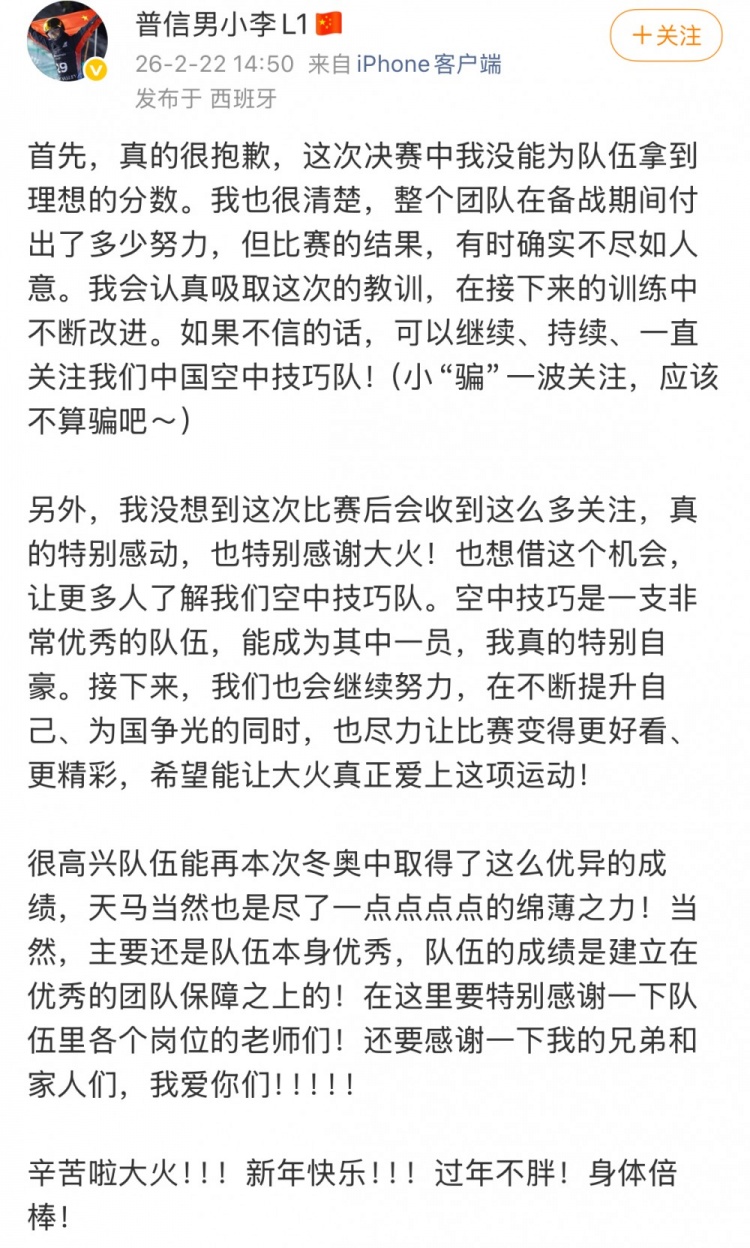 在这场冬奥会的自由式滑雪空中技巧混合团体决赛中,中国队收获了一枚铜牌。而在这个本该辉煌的时刻,李天马却在社媒上发了条看似深情,实则略显无奈的总结,仿佛要让大众知道,他的失误是多么“令人心痛”之事。