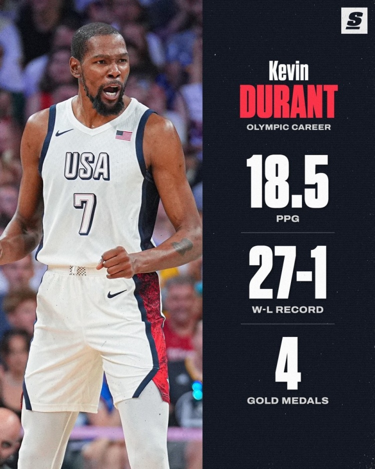 在2024年巴黎奥运会上,尽管杜兰特的场均得分减至13.8分,但他依然表现稳定,出战6场,平均贡献3.2个篮板、2.3次助攻、1次抢断及0.2次盖帽。他的投篮命中率为54%,三分命中率为51.9%,罚球命中率则有93.8%的优异表现。