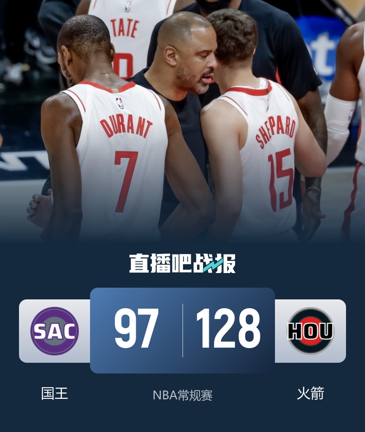 火箭队大胜国王队 申京砍下26分13篮板11助攻 谢泼德首发贡献28分 杜兰特三节录得21分5篮板_NBA直播