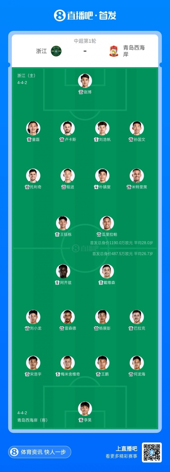 浙江与西海岸首发阵容揭晓 五名外援对抗四名外援 王钰栋与托利奇首发 阿齐兹参战_中超直播
