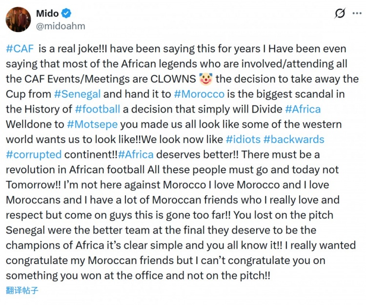 3月19日讯,前埃及国脚米多在社交媒体上发表了对非洲足联剥夺塞内加尔非洲杯冠军一事的看法。他表示:“非洲足联实在让人感到可笑!多年来我一直有这样的感觉,并且曾经公开表示,那些参与或出席非洲足联各项活动和会议的传奇人士们,其实只是一群可笑的角色。”