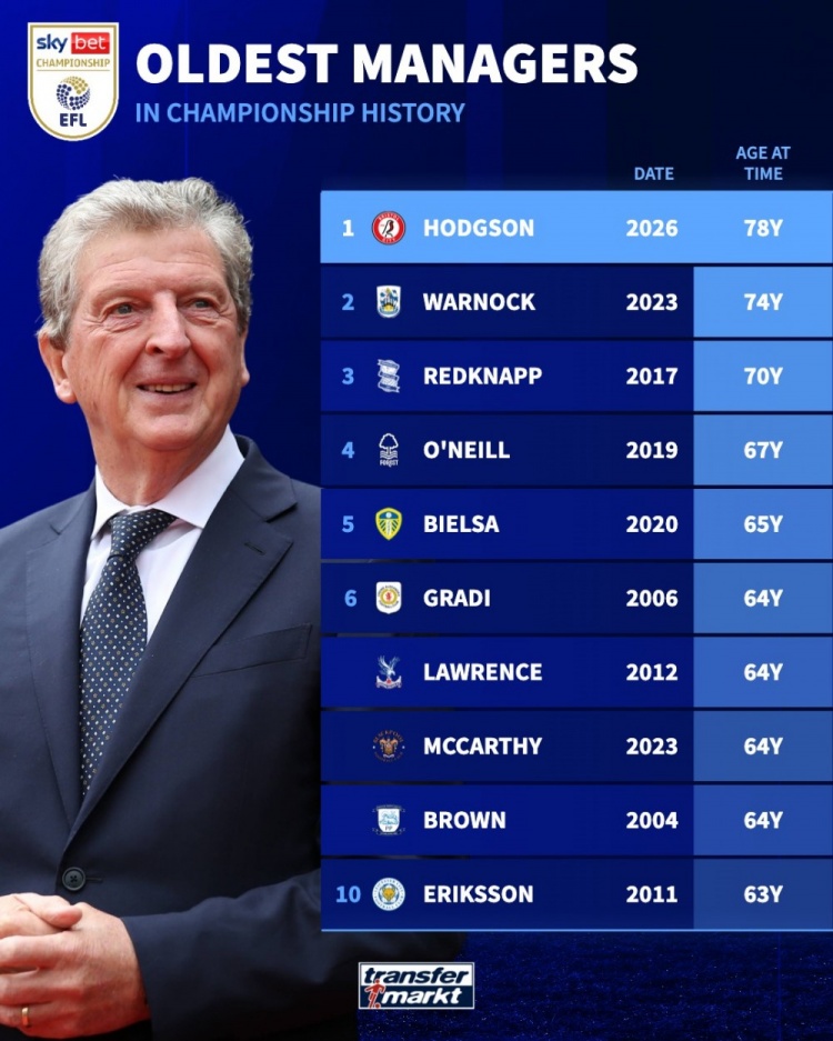 在最近的德国转会市场统计中,英冠历史上最年长的主帅名单出炉,令人惊讶的是,近期刚刚接管布里斯托尔城的霍奇森以78岁的高龄,成为了这一榜单的第一位。