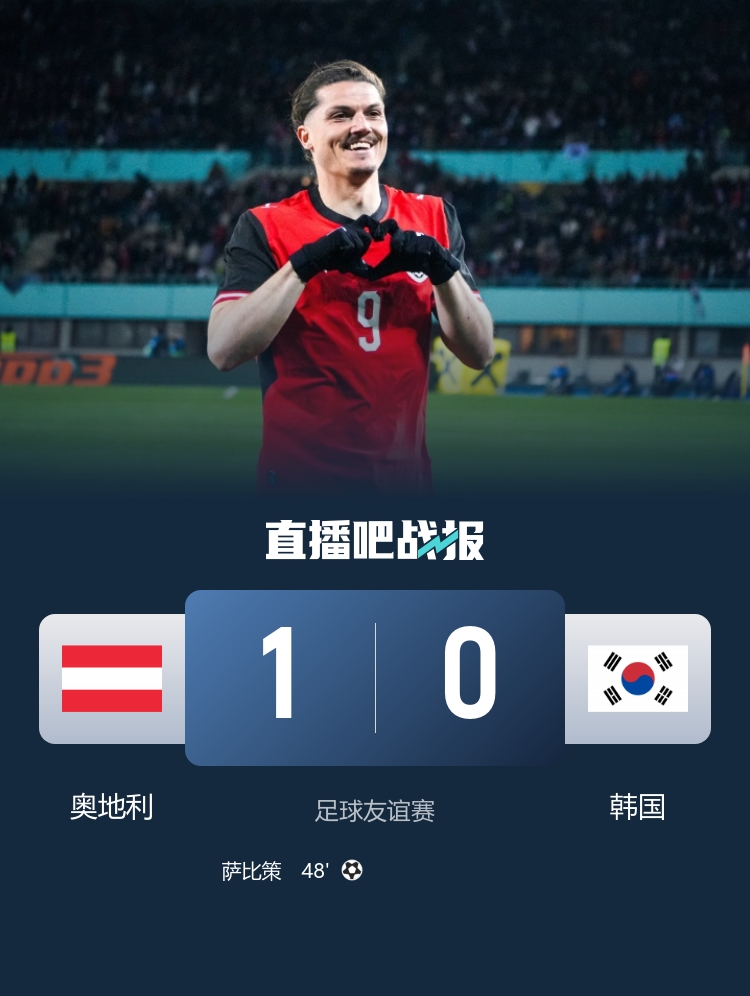 下半场的比赛则迎来了转折,49分钟时,泽弗尔·施拉格精准的传中球为奥地利打开胜利之门,萨比策在禁区内的抢点扫射,犹如一箭穿心,洞穿了韩国防线,奥地利随即以1-0领先。