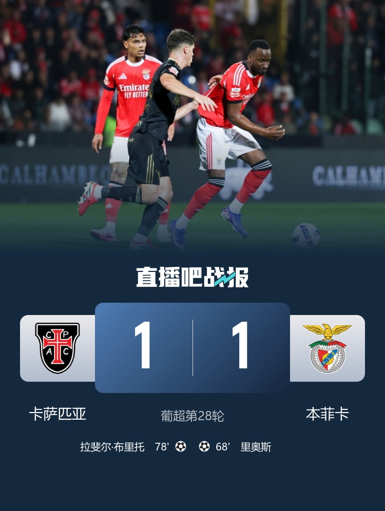 本菲卡平局告终无缘三连胜 卡萨匹亚逼平距离榜首依旧有七分差距 里奥斯进球布里托追平_葡超直播
