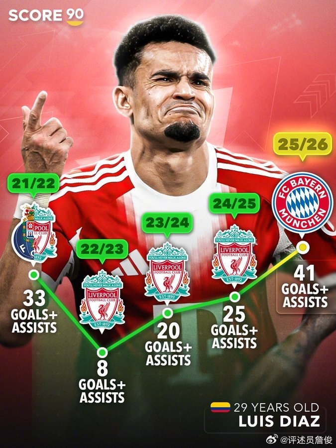 谈到迪亚斯,他在这个赛季以近六千五百万镑的转会费加盟拜仁后,完全释放了自己的潜力,迄今为止为球队贡献了23个进球和18个助攻,创造了个人职业生涯的新纪录。无疑,这位哥伦比亚球员在球场上的表现令人振奋,大家都期待着他能在美加墨世界杯中引领国家队争夺小组第二的位置,与葡萄牙、民主刚果和乌兹别克并肩作战。