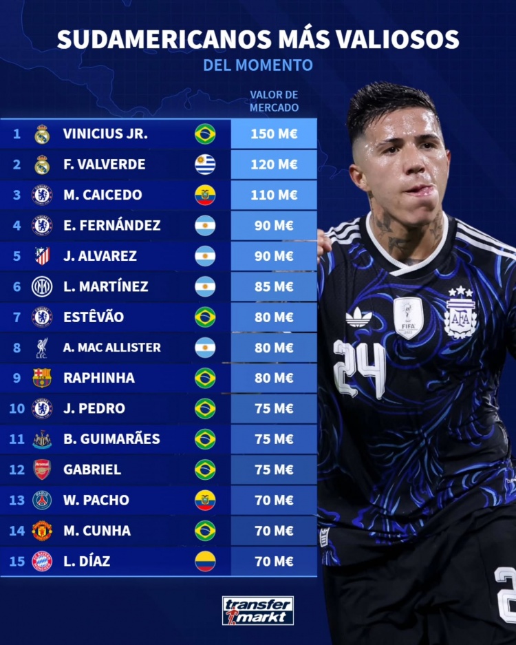 南美球员身价榜:维尼修斯以1.5亿欧的身价遥遥领先,巴尔韦德在后面追赶可怜兮兮_英超直播