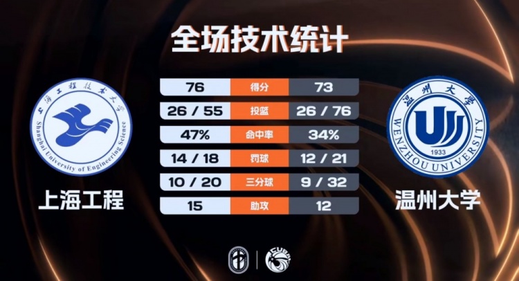 在球场上的数据同样令人瞩目。上海工程的陈子康交出了20分的佳绩,孙发航也贡献了17分和8个篮板,而温州大学的盛家铭则以16分的表现尽力支持着球队。整个比赛充满了竞争的火花,每位球员都在为胜利拼尽全力。