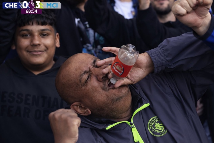 在本轮英超联赛中,曼城以3-0的优异表现战胜了切尔西,继续在追赶阿森纳的征程中书写精彩篇章。比赛进行到第69分钟时,镜头捕捉到一位手握印有阿森纳瓶子的球迷,他尽情地嘲讽庆祝,这一幕将可能成为25-26赛季英超的经典瞬间之一。