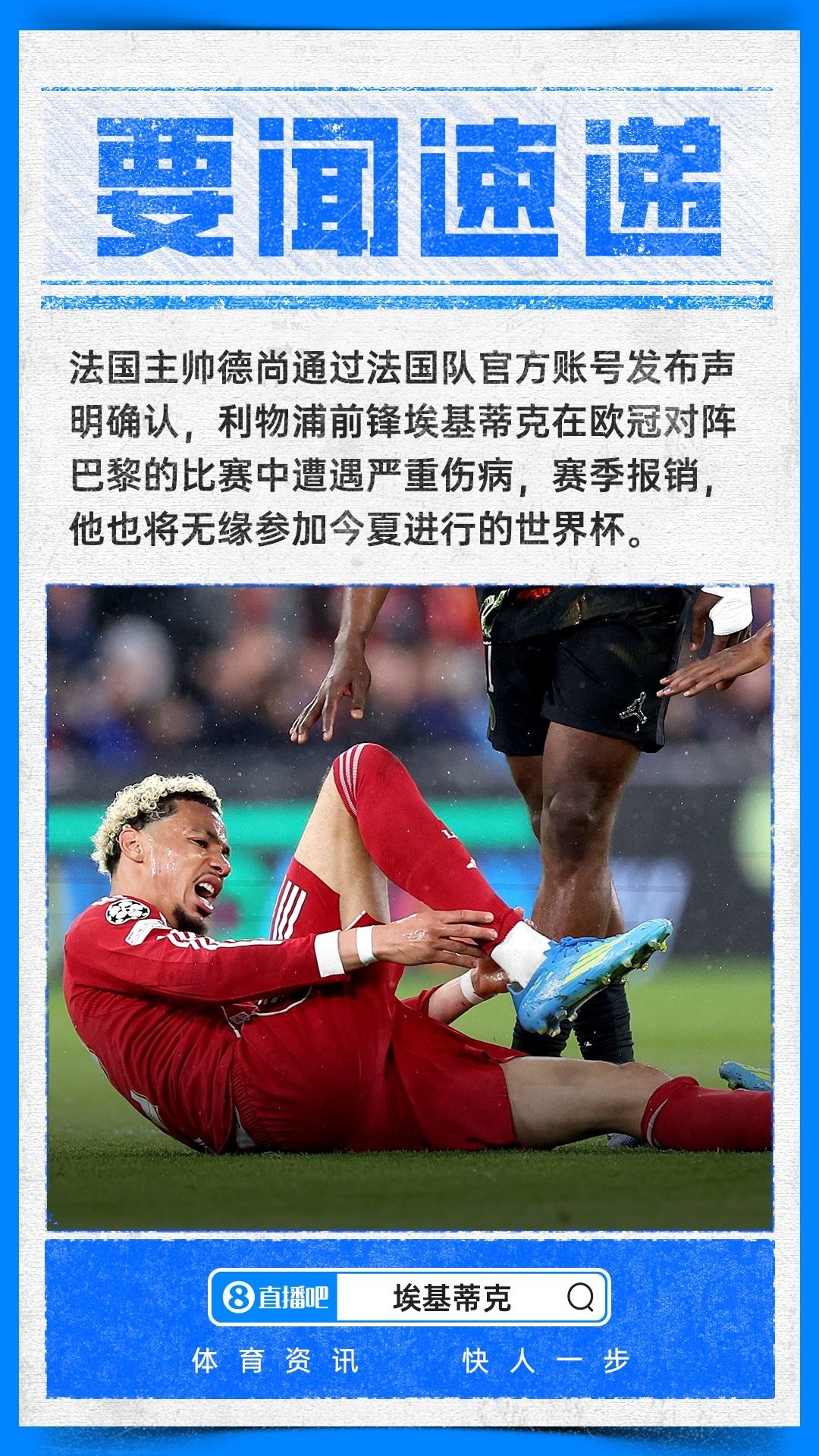 法国队官方宣布埃基蒂克跟腱重伤严重,将缺席整个赛季和世界杯比赛_英超直播