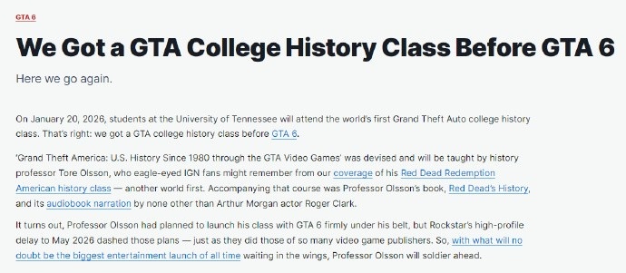 有趣的是,Tore Olsson教授原本打算在《GTA6》成功推出之后开设这门课,但由于游戏的延期,他不得不提前到明年开课。更有意思的是,这并不是Olsson教授第一次使用游戏作为教学工具,他以前曾教授过以《荒野大镖客》为教材的美国西部历史课程,并邀请了《荒野大镖客2》主角亚瑟的配音演员Roger Clark为课程录制有声书籍。