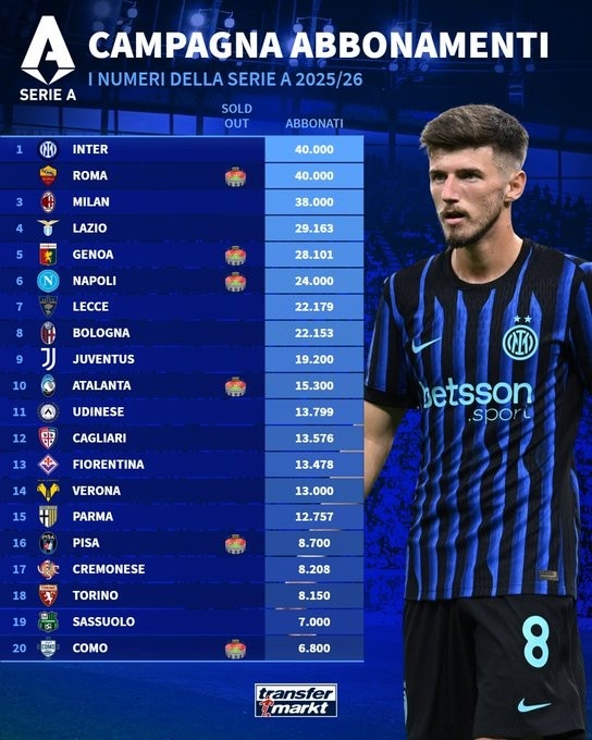意甲这个丰收的季节,季票销售排名一出来,恰如一场引人注目的闹剧。国际米兰和罗马这两家豪门俱乐部,以各自的4万张季票并肩领跑,真是个“神奇的平局”。这样看来,连球迷们也在竞争,看谁的热情更高。