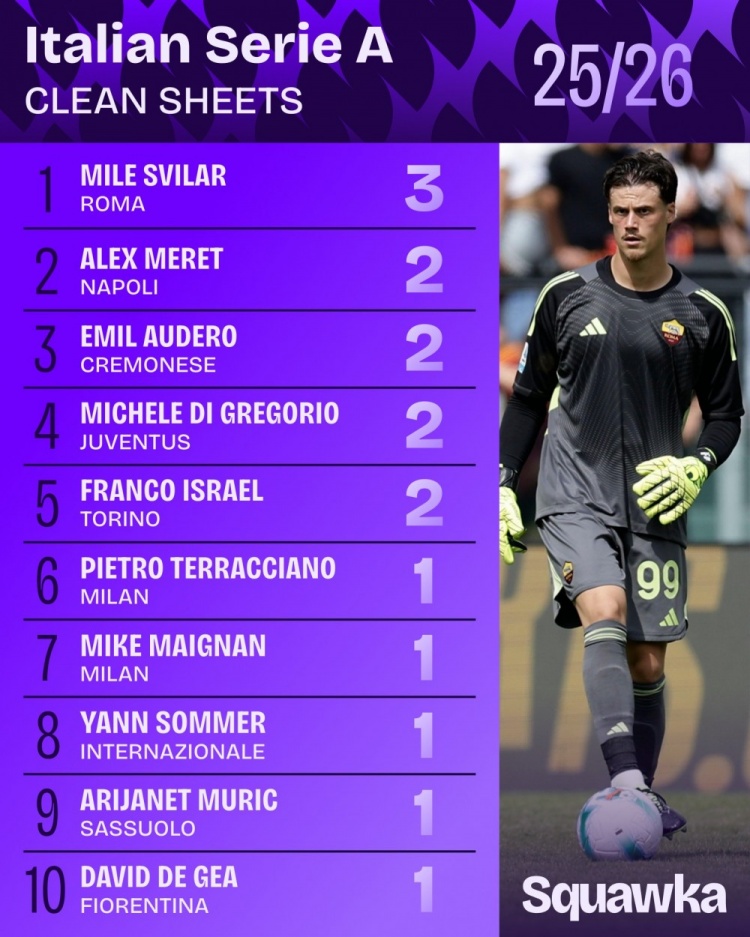 而在他的身后,那不勒斯的梅雷特和克雷莫内塞的奥代罗,两位门将也不甘示弱,凭借各自的努力,他们分别是两次零封,紧随其后,相对来说,也表现出了不俗的防守能力。尤文图斯的迪格雷戈里奥与都灵的伊斯莱尔同样以两次零封跻身前列,显示出意甲门将们在此次赛季中的竞争愈发激烈。