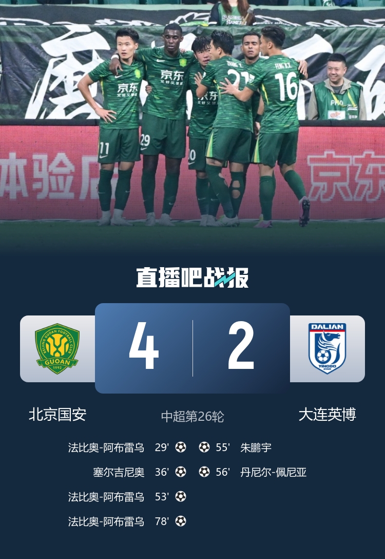 国安破除连败困局 以四比二再克大连英博 法比奥演绎帽子戏法塞鸟助攻俱佳_中超直播