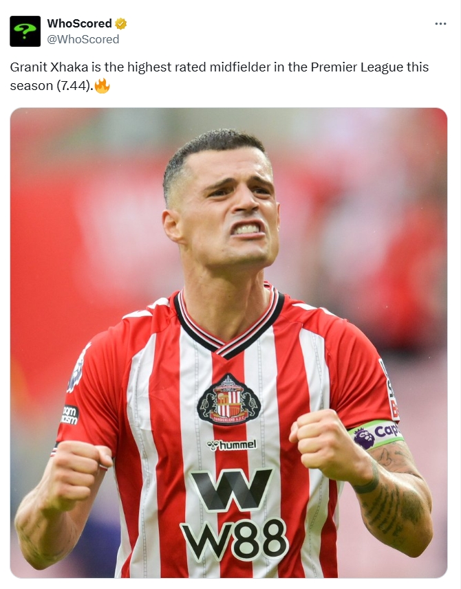 扎卡是一位33岁的瑞士中场球员,本赛季至今已为桑德兰出战6场,送出了3次助攻。在这6场比赛中,扎卡的表现评分分别为:6.6、6.9、7.5、7.7、6.9,以及最后的8.5。根据另一家评分网站WhoScored的数据,扎卡目前是英超赛季中评分最高的中场球员,进一步证明了他在球队中的重要性与影响力。