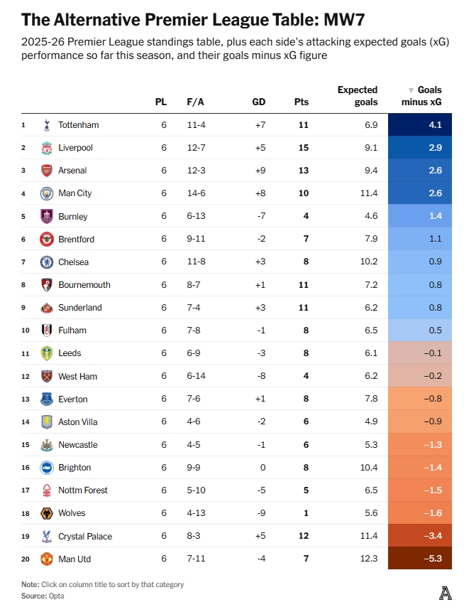 相比之下,热刺在本赛季的表现则可谓耀眼,实际进球比预期进球多出4.1个,紧随其后的是利物浦最多有2.9个,阿森纳和曼城各自表现也不落俗套,均实现了2.6的提升。这种明显的差距让人不禁对曼联的未来感到担忧,红魔究竟能否尽快调整状态,重回正轨,让我们拭目以待。