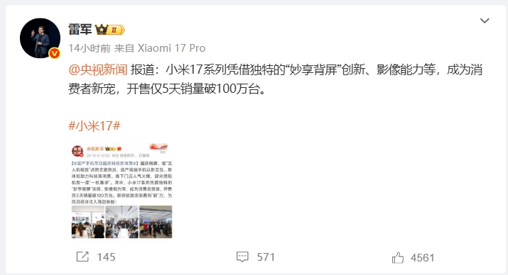 10月6日讯 据央视新闻报道,小米17系列手机在上市仅五天的时间内销量突破了100万台,创下了一个新的里程碑,而小米的创始人雷军也对此进行了确认。