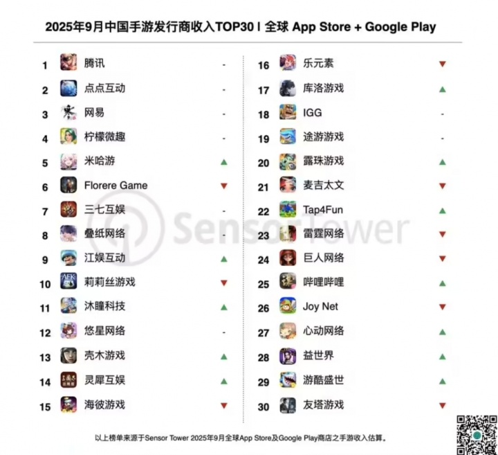 10月09日讯 据Sensor Tower商店情报平台最新发布的报告显示,2025年9月中国手游发行商在全球收入排行中表现出色,共有32家中国公司入围全球手游发行商收入前100名,合计收入达到19.5亿美元,占该期间全球前100名手游发行商总收入的36.1%。