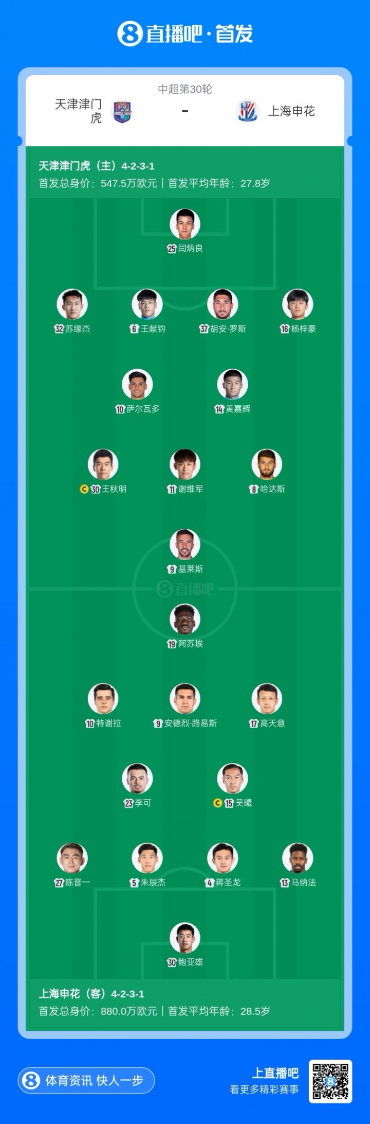 中超收官之战 津门虎与申花的首发阵容 特谢拉和吴曦先发 基莱斯出战_中超直播