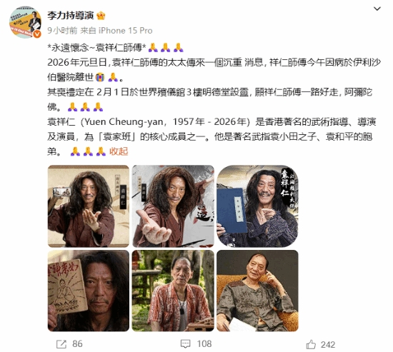 香港导演李力持在个人微博上悲痛地宣布,著名演员兼武术指导袁祥仁于1月1日在伊利沙伯医院因病去世,享年69岁。根据安排,袁祥仁的告别仪式将于2月1日在世界殡仪馆的明德堂举行。