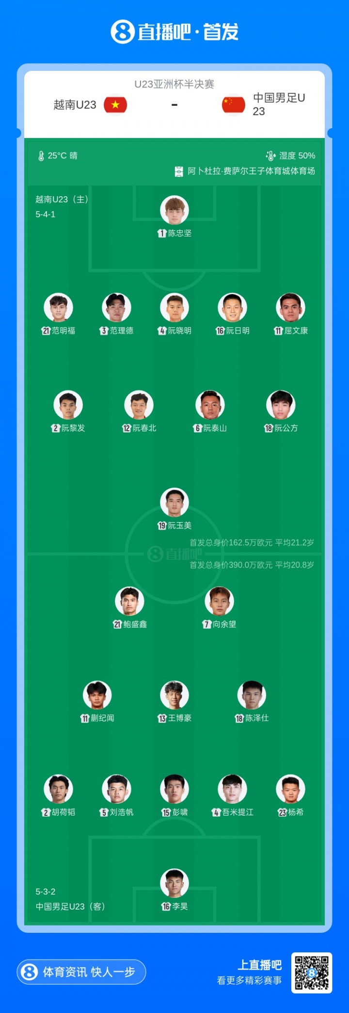 北京时间1月20日23点30分,U23亚洲杯的半决赛正要打响,中国男足U23队迎战越南U23队。赛前,两队的首发阵容已经公布,让我们来看看两队的阵容变化。