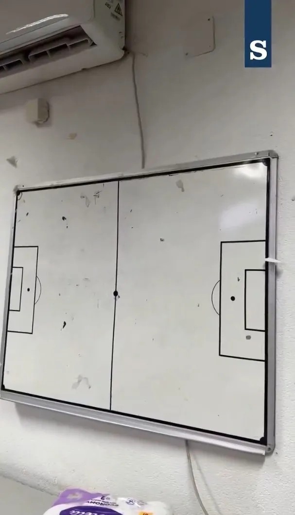 英国媒体《太阳报》转发了这段视频,并对此进行了评论。视频一开场,观众便能看到更衣室左侧的一间小卫生间,走进来则是一条通往更衣室主体区域的破损油毡地面。房间的一侧摆放着一张摇摇晃晃的旧桌子,桌旁是为球员准备的简易长凳。更衣室中央放着一张按摩床,但床面狭小,甚至身材高大的门将多纳鲁马都几乎无法舒展全身。墙上挂着一条“加油,蓝衣军团”的横幅,而旁边则是一块破旧的战术板。